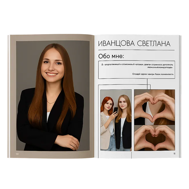 У нас доступно 9 оригинальных дизайнов на выбор: «Премиум», «Персона», «Статус», «Тренд» и другие современные стили. Каждый макет включает в себя портрет выпускника, виньетки всех учеников класса, общие кадры и снимок классного руководителя.