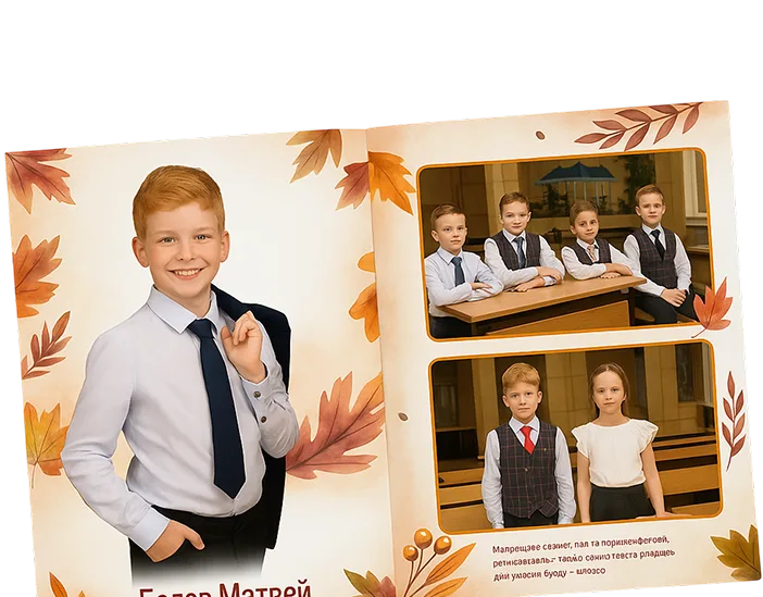 У нас есть 9 вариантов оформления выпускного альбома: «Произведение», «Призвание», «Мечта», «Эксклюзив» и другие. В каждом — портрет выпускника, групповое фото одноклассников и классного руководителя. Возможно обсудить индивидуальный дизайн.