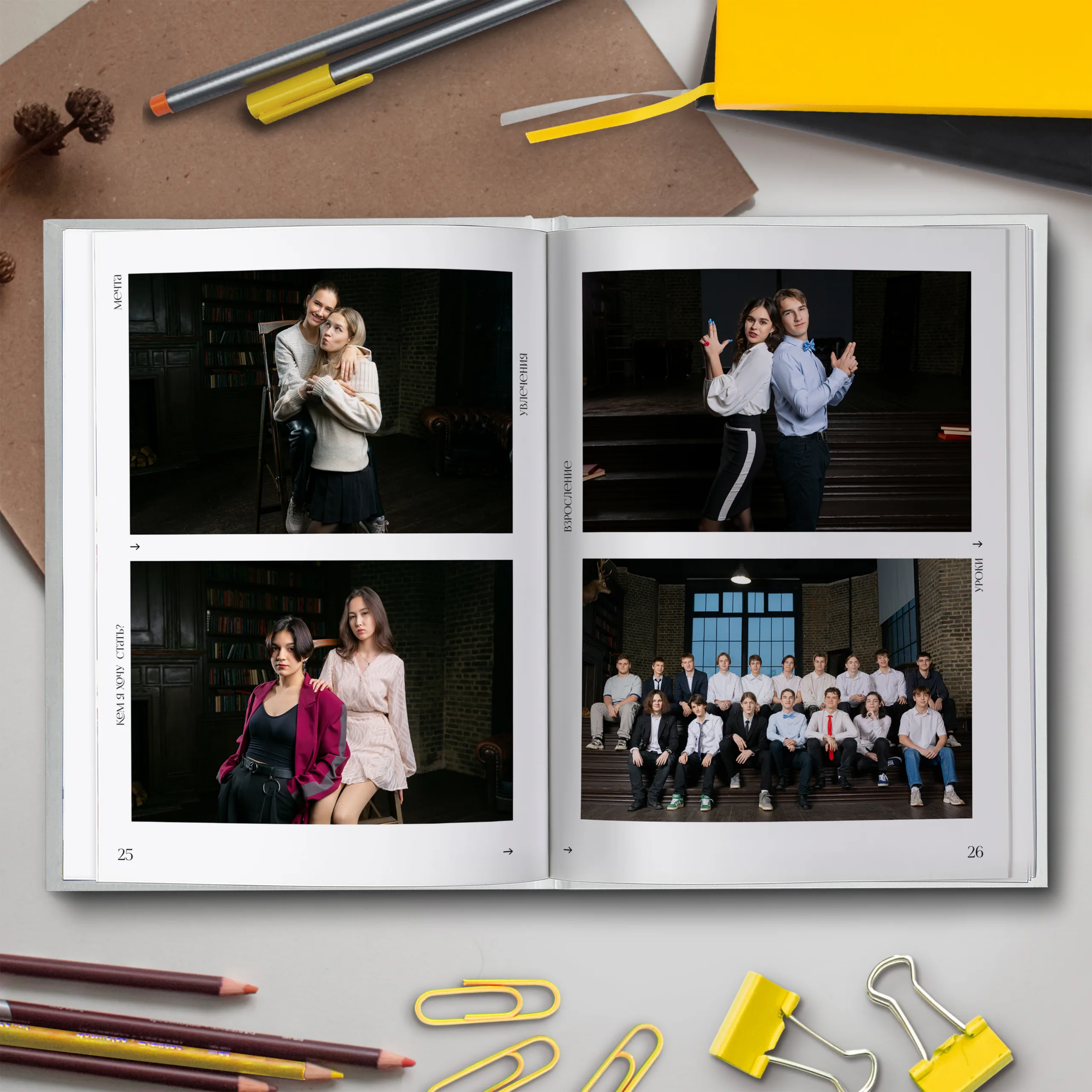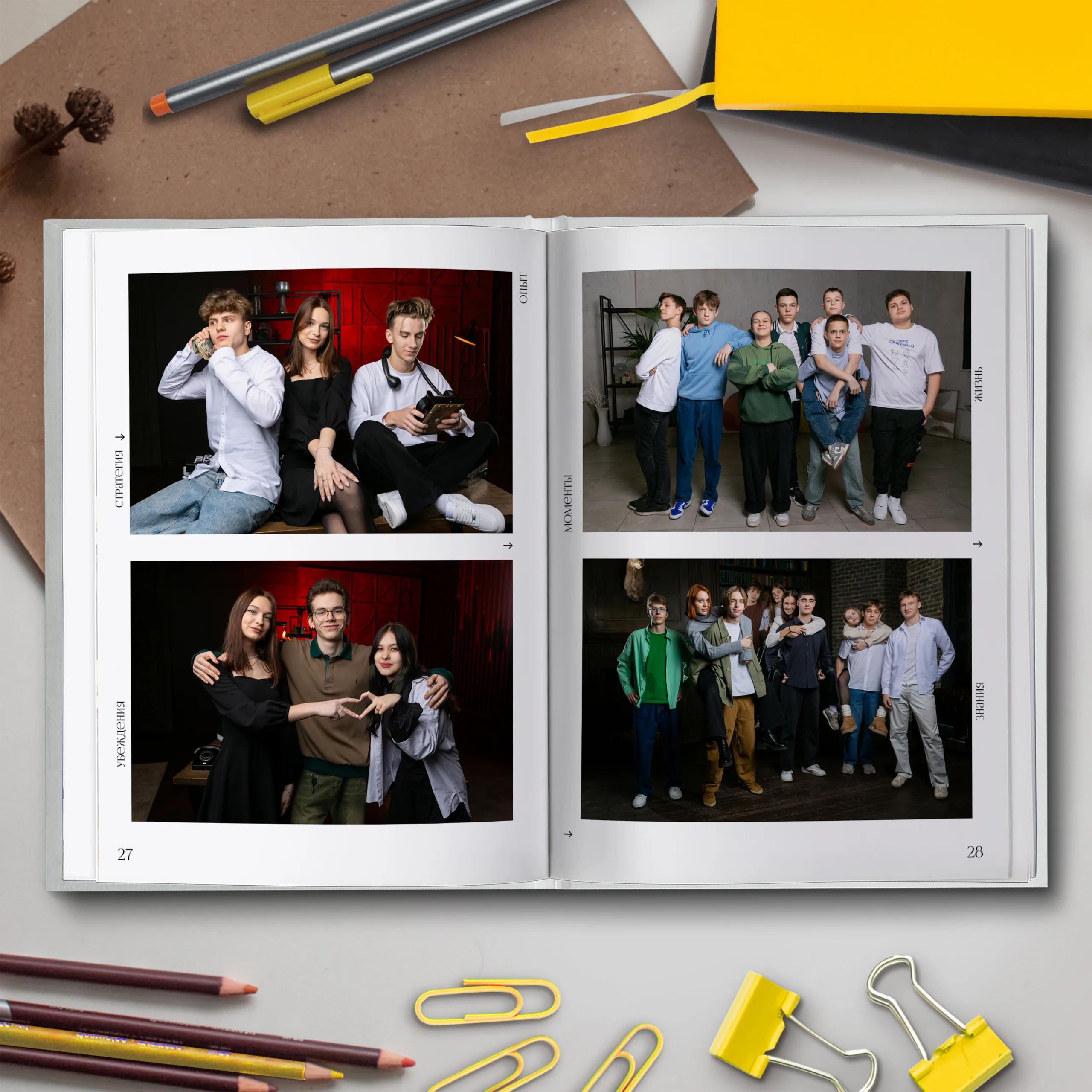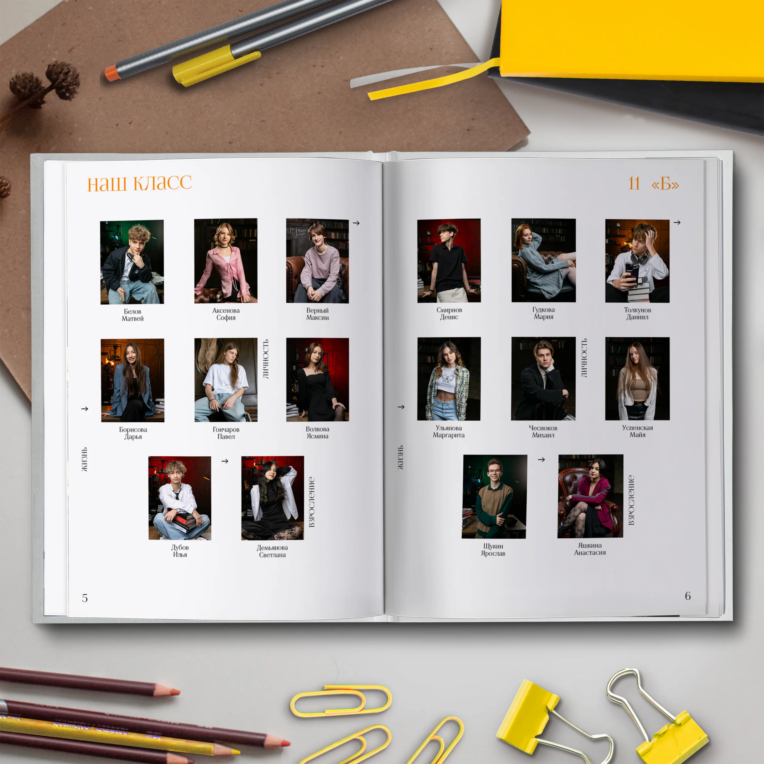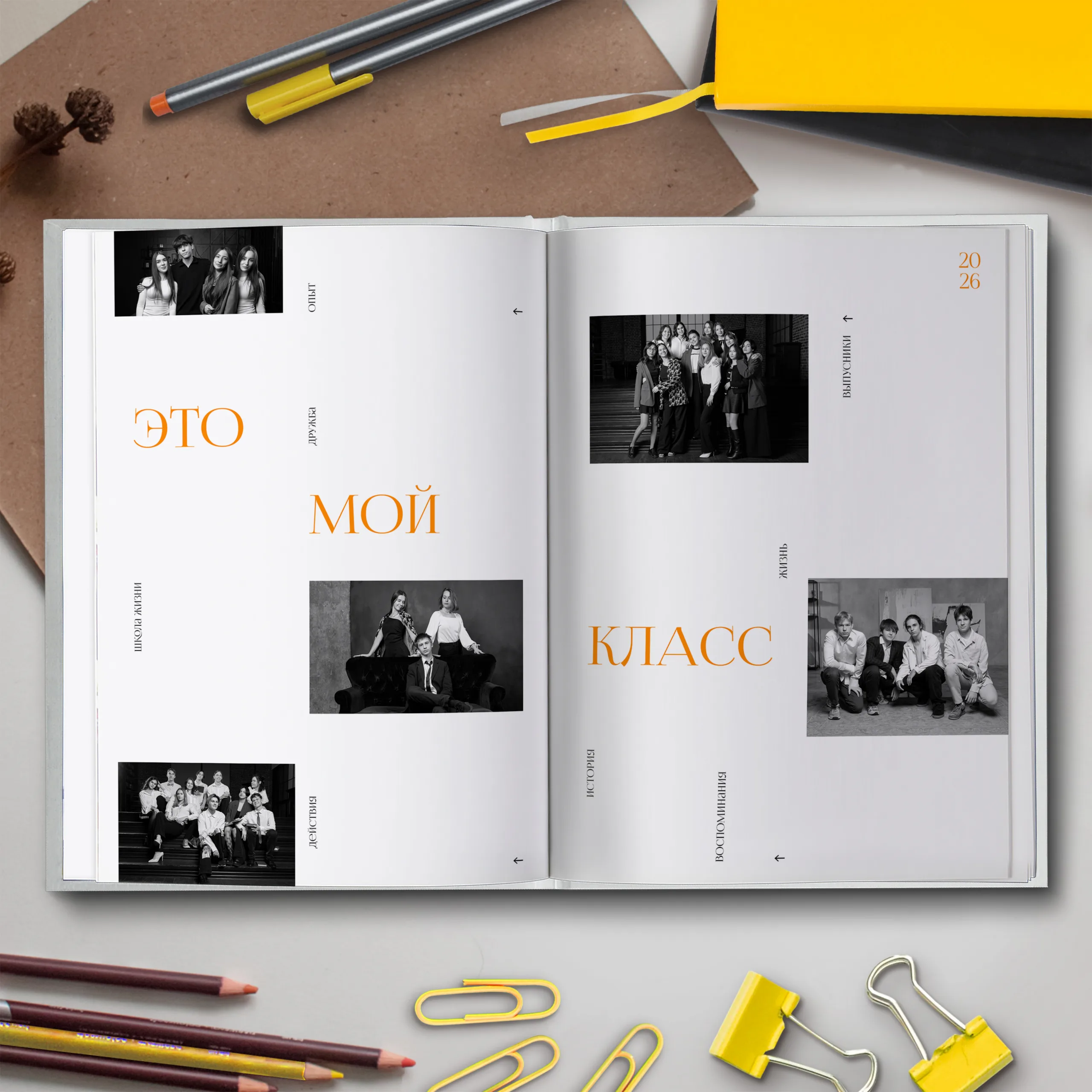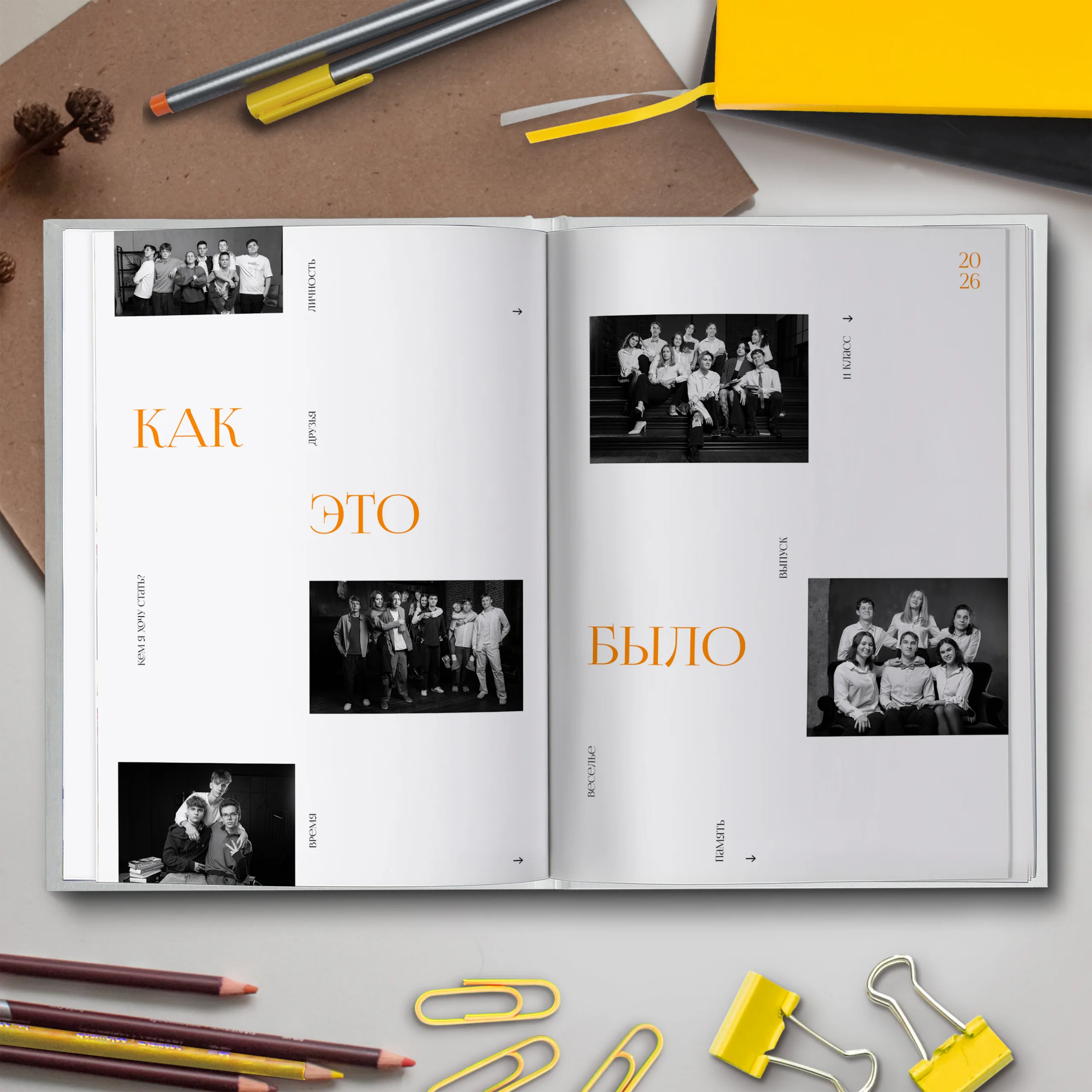1ый разворот — форзац с использованием случайных фотографий общего репортажа